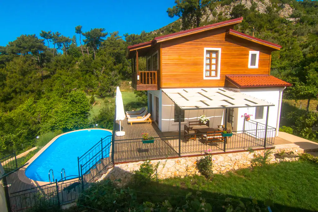 KOD 0730 Antalya Kalkan İslamlar'da yer alan Özel Havuzlu Jakuzili Korunaklı Villa, huzurlu ve konforlu bir doğa tatili arayanlar için mükemmel bir seçenek sunuyor. 3 yatak odası ve 1 salonuyla toplam 6 kişilik konaklama kapasitesine sahip olan villa, tam donanımlı mutfağı ve her detayın düşünüldüğü modern yapısıyla misafirlerine keyifli bir tatil deneyimi vadediyor. Özel havuz ve jakuzisi ile korunaklı yapısı sayesinde, tatiliniz boyunca sadece size özel bir alan sunuluyor. Villanın geniş bahçesi, havuz manzarası ve barbekü alanı, hem dinlenme hem de eğlence için harika bir ortam sağlıyor. Odalarında klima, çamaşır makinesi, TV ve Wi-Fi gibi tüm ihtiyaçlar karşılanırken, ebeveyn banyolu odalar ekstra rahatlık sunuyor. 200 m² büyüklüğündeki villa, ahşap zeminleri ve zarif mobilyaları ile misafirlerine konforlu bir konaklama sunarken, doğayla iç içe huzur dolu bir atmosfer sağlıyor.