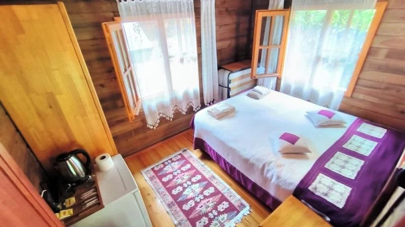 Vadinin yeşilini, derenin sesini ve şelalenin serinliğini aynı pencereden görebileceğiniz bir konaklama hayal edin. Ahşabın sıcaklığıyla kurulmuş, doğaya saygılı mimaride tasarlanan bungalovlar; sabahları kuş sesleriyle, akşamları ormanın ağır ağır koyulaşan renkleriyle nefes alıyor. Balkon ya da teraslı seçenekler gün boyu dışarıyla bağınızı açık tutarken, içeride özenli temizlik ve sade şıklık ferah bir atmosfer yaratıyor. Odalar, bölgenin iklimine uygun ısıtma-soğutma çözümleri, rahat yataklar, temiz banyo alanı ve ihtiyaç duyulan temel olanaklarla tamamlanıyor. Wi-Fi erişimi, doğanın ortasında dahi gündelik akışınızı sürdürebilmenizi sağlıyor. Aileler, çiftler ya da arkadaş grupları için farklı kapasitelerdeki birimler; birlikte vakit geçirmeyi kolaylaştıran planlarda kurgulanmış. Ahşap dokunun verdiği huzur, gereksiz gösterişten uzak bir zarafetle birleşiyor. Güne, yöresel ürünlerle hazırlanmış zengin bir kahvaltıyla başlamak burada ritüele dönüşüyor. Taze ekmekler, yerel peynirler, mevsim reçelleri ve sıcacık çay eşliğinde vadiye karşı uzun sofralar kuruluyor. Günün devamında dilerseniz dere kenarında yürüyüşe çıkabilir, tarihi taş köprülerin gölgesinde mola verebilir ya da kısa bir patika sonrası şelaleye ulaşarak serinliğin tadını çıkarabilirsiniz. Fotoğraf meraklıları için sisin ormanla buluştuğu sabah saatleri eşsiz; doğa yürüyüşü sevenler içinse vadinin patikaları gün boyu keşfe açık. Tesiste yer alan çardak alanları, misafirlere doğayla iç içe keyifli anlar sunuyor. Bu alanlarda mangal yapabilir, akşamları sevdiklerinizle açık havada yemek yiyebilir, dere sesi eşliğinde günün yorgunluğunu atabilirsiniz. Ortak mutfak bölümünde ise temel mutfak gereçlerinden buzdolabına kadar ihtiyaç duyulabilecek tüm ekipmanlar bulunuyor; böylece dileyen misafirler kendi yemeklerini hazırlayabiliyor. Doğal ortamla iç içe, sade ama özgür bir tatil anlayışı burada gerçeğe dönüşüyor. Akşam olduğunda mekân kendi ritmine çekiliyor. Ahşap teraslarda hafif bir esinti, uzaklardan gelen su sesi ve gökyüzünde parlayan yıldızlar… Tesisin ortak alanları sakin sohbetler için toplanma noktası, odalar ise günün yorgunluğunu bırakmak için konforlu bir sığınak. Otopark imkânı ve güler yüzlü karşılama, gelişten ayrılışa kadar olan süreci pratik ve huzurlu kılıyor. Konum, bölgeyi deneyimlemek isteyenler için ideal. Kısa sürüş mesafelerinde sahil kasabaları, yayla yolları ve yerel lezzet durakları bulunuyor. Dilerseniz tüm günü vadinin içinde geçirip doğanın ritmine kapılırsınız; dilerseniz çevredeki rotaları keşfedip akşamları sessiz ve güvenli bir atmosfere dönersiniz.