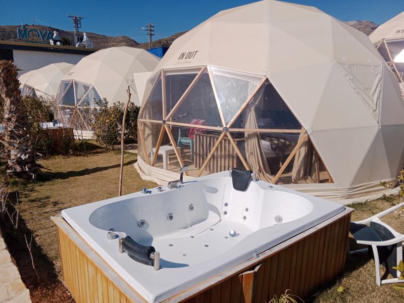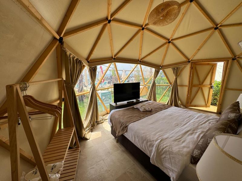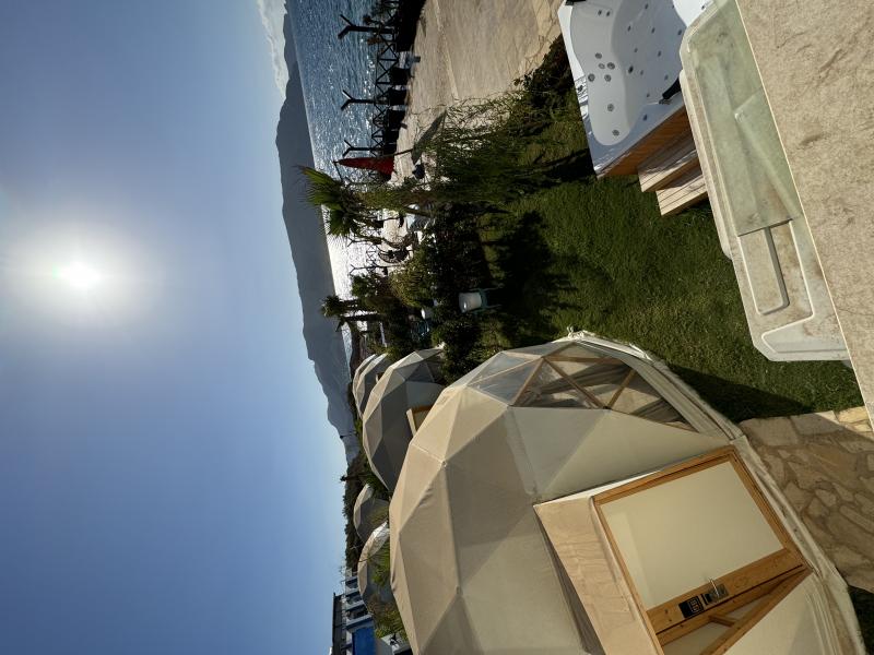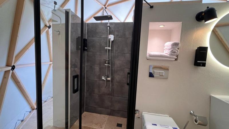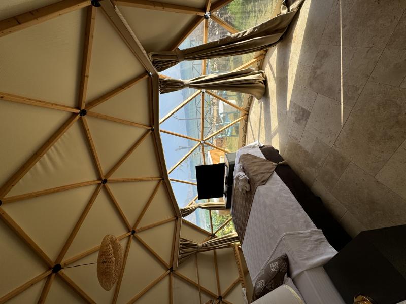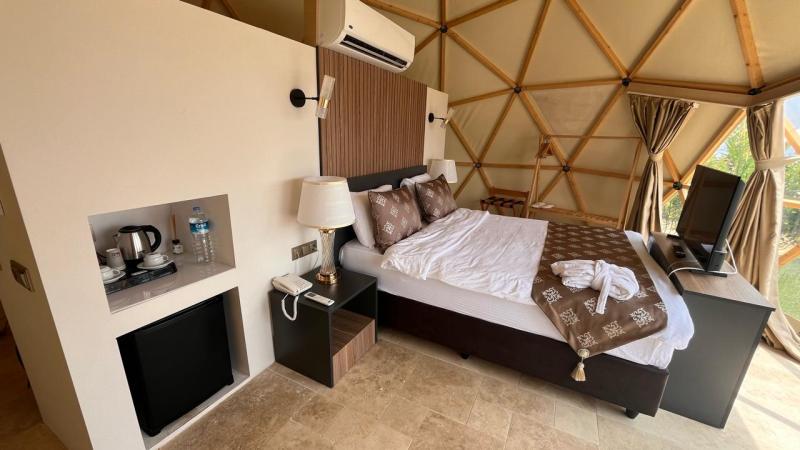 Fikir güzel ancak glamping konsepti sınıfta kaldı. Gün boyu güneş alıyor sabah sıcaktab uyuyamıyorsunuz. Gün içinde odaya girmek imkansız kilma açıkta olsa aşırı ısınıyor. Ağaçlandırma ve gölgelendirme yapılmalı. Betonarme oda güzeldi. Restoran kısmı harika tüm akşam yemeklerinizi yiyebilirsiniz. Alkol fiyatları piyasadan yüksek.