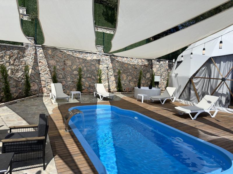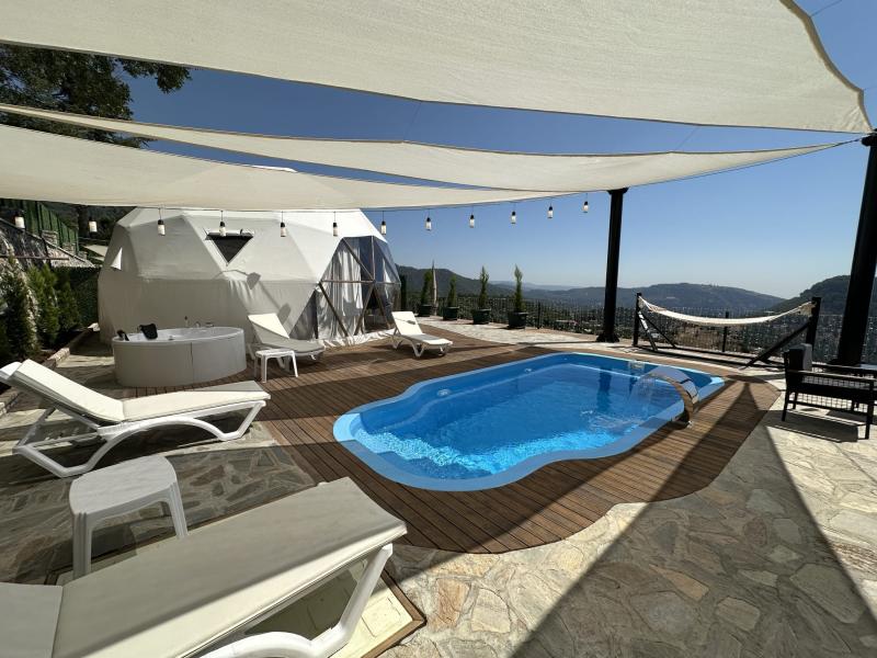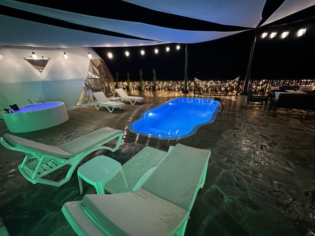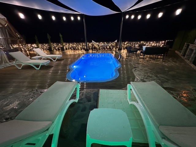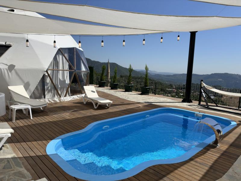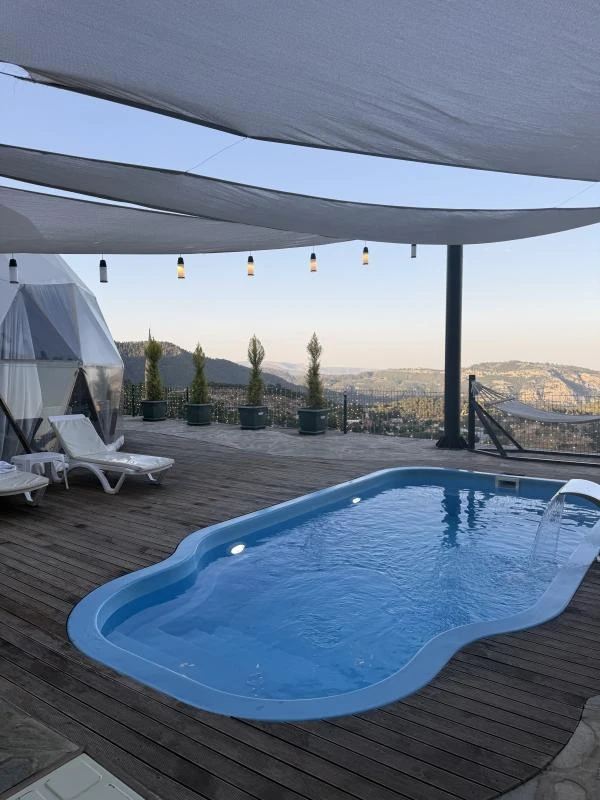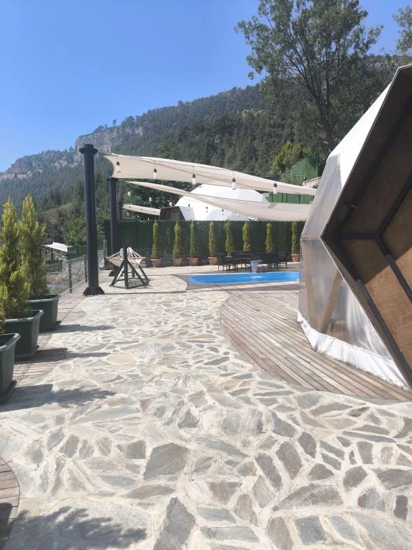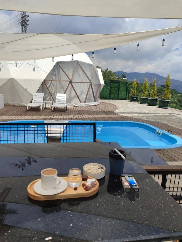 Tesis hizmetinden çok memnun kaldık. Glamping de 1 gece geçirdik. Temiz, ferah genişti. Sıcak suyu, sıcak soğuk kliması, sinevizyon (e-posta istediği için biz giriş yapamadık) mutfak araç gereçleri vs her şey bilgiler de olduğu gibi vardı. Havuz ısıtmalı olduğu için ılıktı. Lakin benim gibi mahremiyete önem verenler için Glamping havuz ve jakuzisi dışarıda olduğu için bu yönde bana uygun değildi. Ama normal tesettürlü bayanlar havuza haşema ile girilebilir. Yeşil çit tarzı şeyler ile kapalı olduğu için rahat edebilirler.