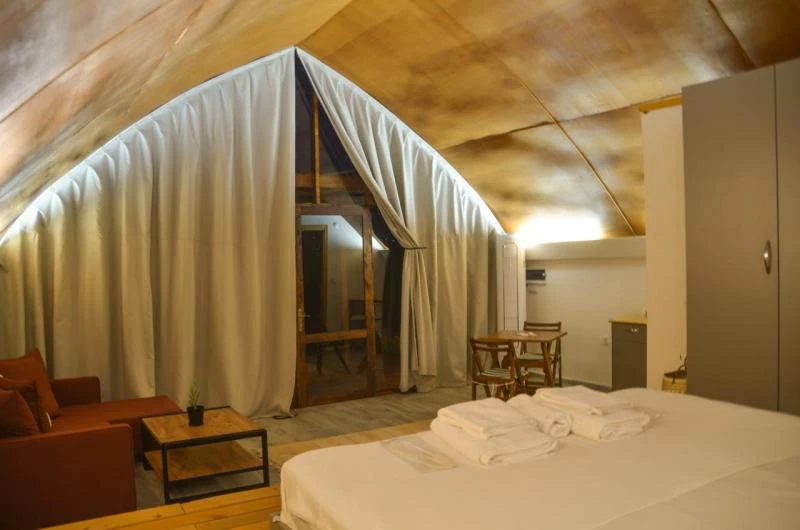 İzmir’in en huzurlu köşelerinden Seferihisar’da, adeta bir cennet bahçesini andıran bu tatlı glamping tesisi sizi bambaşka bir dünyaya davet ediyor. Ortak havuzu, palmiyelerle çevrili dinlenme alanları, şezlong ve şemsiyeleriyle yazın tadını yavaş yavaş çıkarmak isteyenler için tam bir saklı köşe. Konaklama, doğayla iç içe ama bir o kadar da konforlu! Bahçeye açılan glamping alanlarında sabah kuş sesleriyle uyanıyor, gün boyunca terasta ya da yemyeşil bahçede zamanın nasıl geçtiğini anlamıyorsunuz. Tesisin hemen yakınında rüzgar sörfü yapabileceğiniz alanlar ve şaraphane turları gibi keyifli deneyimler mevcut. Üstelik tarihi Sığacık Kalesi ve masmavi Akkum Plajı yalnızca 15 dakikalık mesafede. Dilerseniz gününüzü denizde geçirin, akşamüstü tesisin kendi kafesinde kahvenizi yudumlayın ya da bar/lounge alanında bir içecekle günün yorgunluğunu geride bırakın. Ücretsiz otoparkı, hayvan dostu yaklaşımı ve doğayla uyumlu sakin atmosferiyle burası sadece bir konaklama noktası değil, aynı zamanda nefes alacağınız bir yaşam alanı. İzmir’de sıradan tatil planlarının dışına çıkmak ve biraz “sakinlik, doğa ve tatlı bir deneyim” arıyorsanız, doğru yerdesiniz.