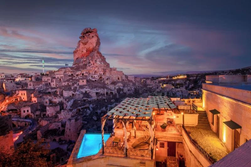 Kapadokya’nın doğal kaya formasyonlarının arasında konumlanan bu konaklama tesisi, taş ve mağara mimarisinin otantik havasını modern konforla birleştiriyor. Oyulmuş taş odalar, kaya dokusunu koruyan doğal detaylar ve rahat yatak düzeniyle hem çiftler hem aileler hem de arkadaş grupları için huzurlu ve sıcak bir konaklama ortamı sunuyor. Mahremiyet ve sade dekorasyon odaklı atmosfer, misafirlerine doğayla baş başa bir tatil vadediyor. Tesis, konuklarına ücretsiz Wi-Fi, açık yüzme havuzu, sıcak/soğuk içecek servisi ve tur organizasyonu gibi hizmetler sunuyor. Vadi ve kaya manzaralı odalar, geniş pencereleriyle gün doğumu ve gün batımını izleme imkânı tanıyor; bu sayede hem aktif keşif arayanlar hem de dinginlik arayanlar için dengeli ve keyifli bir tatil alternatifi sağlıyor.
